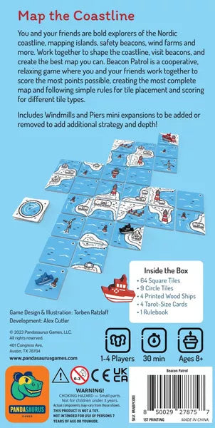 Beacon Patrol is a co-op tile-laying exploration game in which you navigate the coast of the North Sea to secure its beacon buoys, lighthouses and waterways.