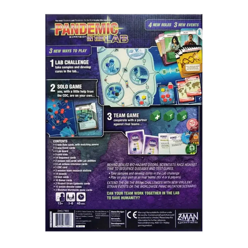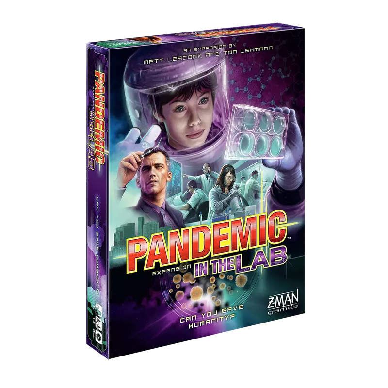 In Pandemic: In the Lab, the second expansion for Pandemic, you will use a new game board that allows you to move the pawns in a laboratory. The goal of this activity is the same as in the base game – finding cures for diseases – but this time in a new way. Behind sealed bio-hazard doors, scientists race against time to sequence diseases, take samples, and test cures.