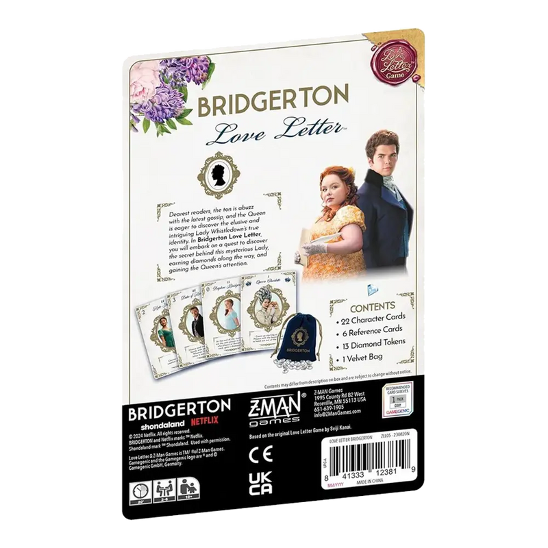 Multiple characters from the Bridgerton series on Netflix are featured in Love Letter: Bridgerton, and thematically you are trying to figure out Lady Whistledown's identity. The game includes Queen Charlotte as a special character who gives you the power to eliminate multiple players in a single turn.