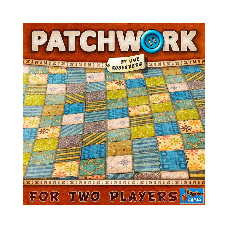 In Patchwork, two players compete to build the most aesthetic (and high-scoring) patchwork quilt on a personal 9x9 game board. To start play, lay out all of the patches at random in a circle and place a marker directly clockwise of the 2-1 patch. Each player takes five buttons — the currency/points in the game — and someone is chosen as the start player.