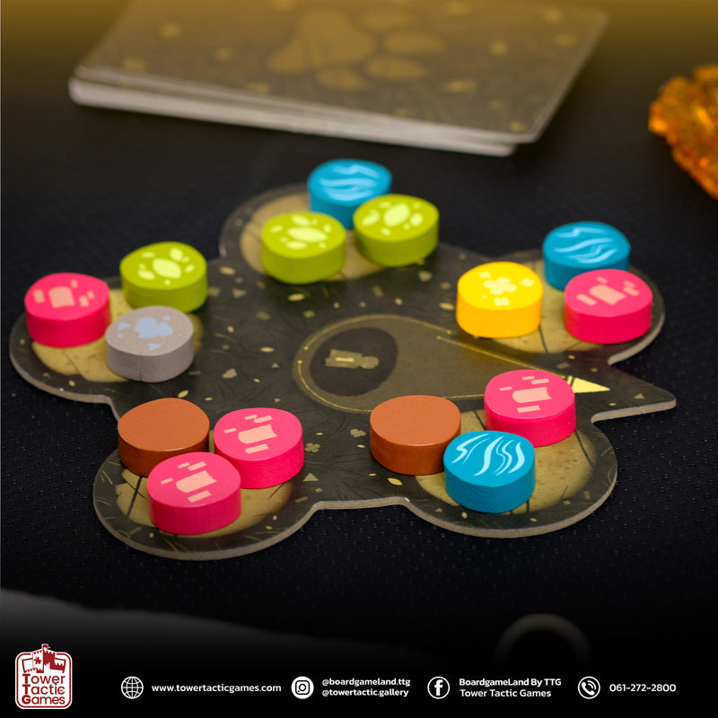 1. วางกระดานหลักไว้ตรงกลาง สุ่มหยิบโทเคนในถุงผ้ามาวางช่องละ 3 ชิ้น