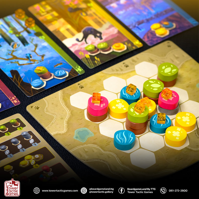 3. แต่ละตาผู้เล่นสามารถเลือกหยิบการ์ดสัตว์ 1 ใบ (หรือจะไม่หยิบก็ได้) สัตว์แต่ละตัวจะเข้ามาอยู่พื้นที่ของเรา เมื่อสามารถวางโทเค่นตามรูปแบบที่การ์ดสัตว์กำหนดไว้
